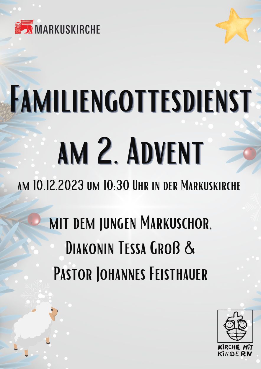 Herzliche Einladung zum Familiengottesdienst am 2. Advent in der Markuskirche Hannover. Der JungeMarkusChor unter der Ltg. von Ida Barleben wird singen. Der Gottesdienst richtet sich an Familien mit Kindern im Kindergarten- und jungen Grundschulalter.