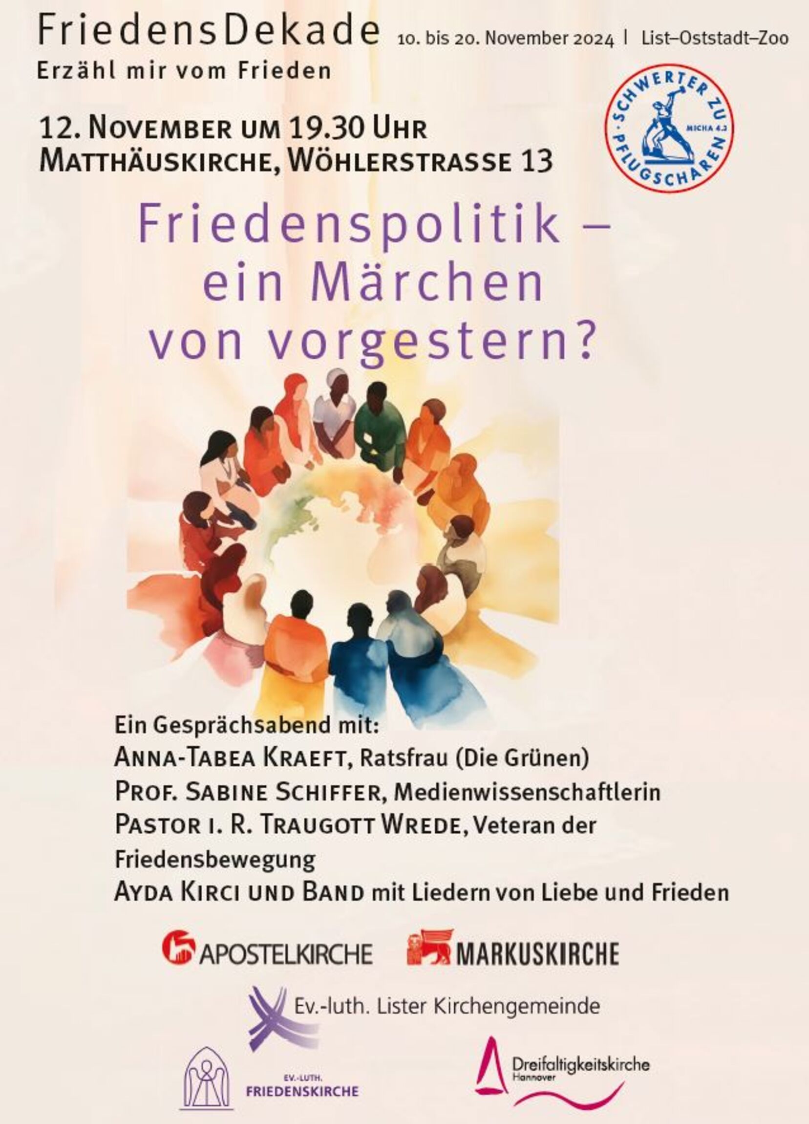 Gesprächsabend am 12.11. um 19.30 Uhr mit Gästen aus drei verschiedenen Generationen: Die Friedenssehnsucht ist groß und wächst mit jeder Eskalationsstufe der erschreckend brutal geführten Konflikte in der Ukraine und im Nahen Osten. Aber wie den Frieden schaffen? Frieden schaffen ohne Waffen? Durch Verständnis der Sicherheitsbedürfnisse des je anderen. Oder war die Entspannungspolitik der 70iger und 80iger Jahre illusionär oder stärkte sogar ein aggressives Russland? Also: Frieden schaffen durch Aufrüstung und militärische Stärke?