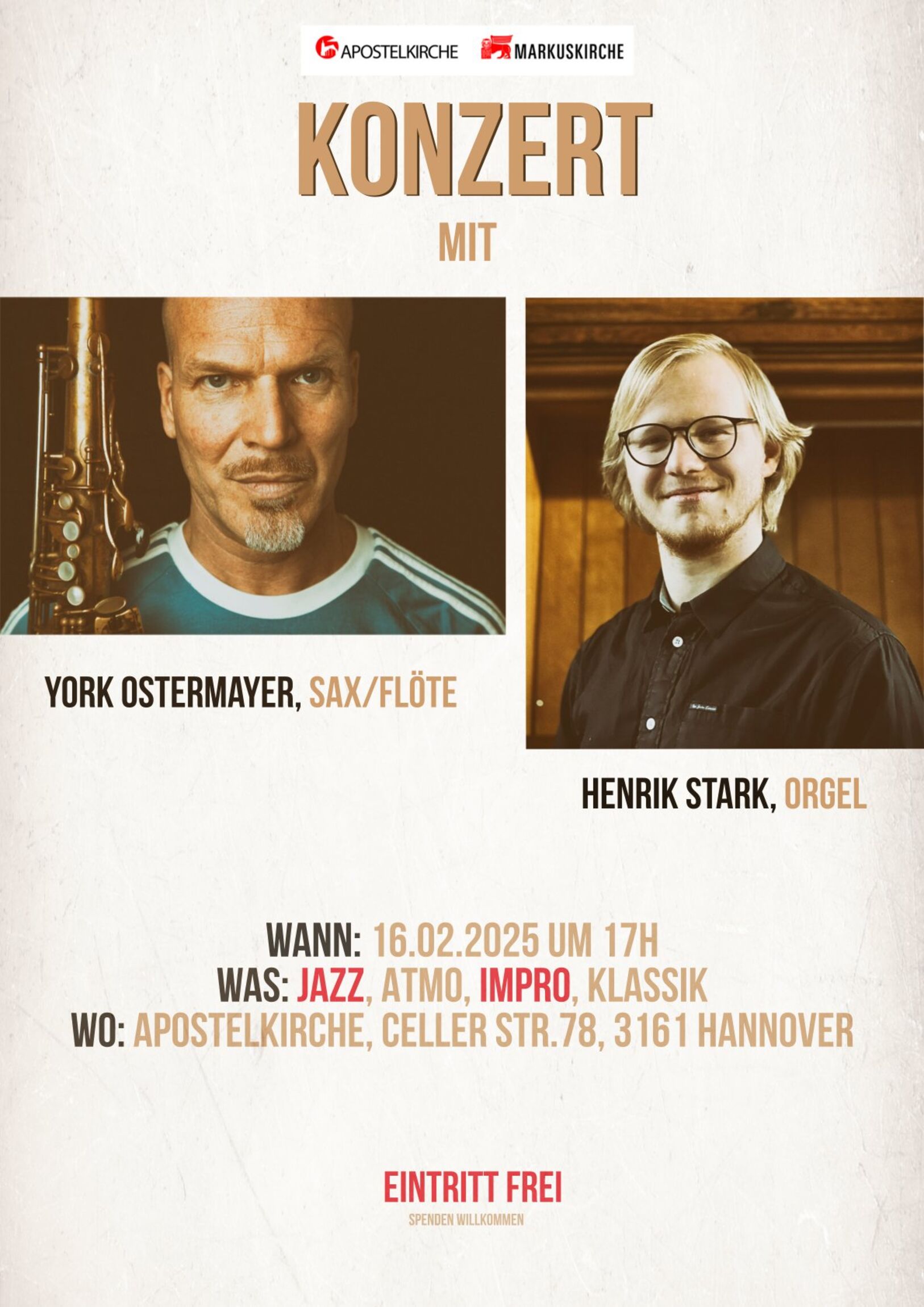 Am Sonntag, den 16.2. um 17 Uhr spielen York Ostermayer (Saxophon und Flöte) und Henrik Start (Orgel) in der Apostelkirche einen bunten Mix aus Jazz, Atmo, Improvisationen und Klassik.