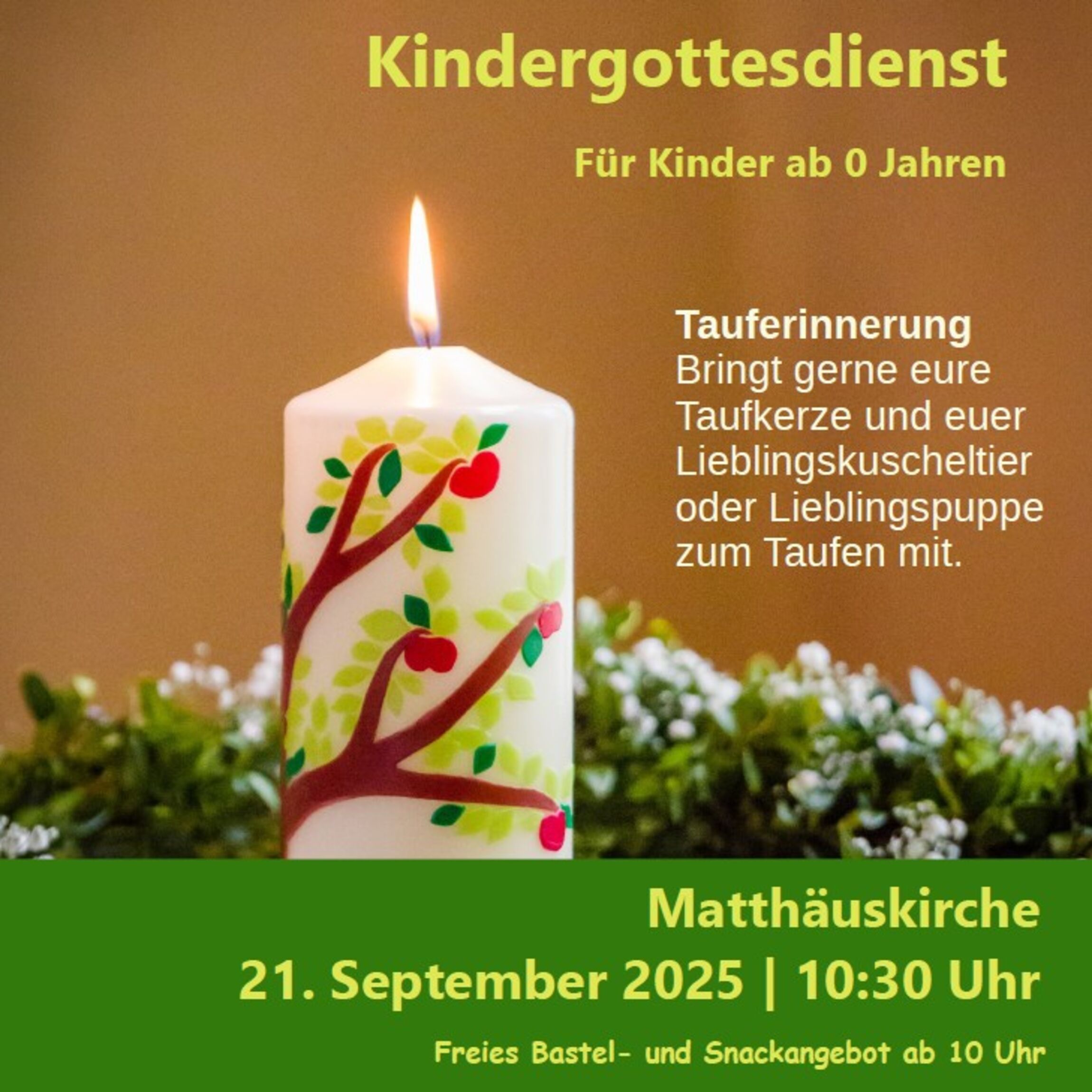 herzliche Einladung zum Kindergottesdienst am 21.9. in der Matthäuskirche. Eingeladen sind alle Kinder ab 0 Jahren. Unter der Überschrift "Tauferinnerung" gibt es schon ab 10 Uhr ein freies Bastel- und Snackangebot, um 10:30 Uhr feiern wir einen bunten, lebendigen Kindergottesdienst.