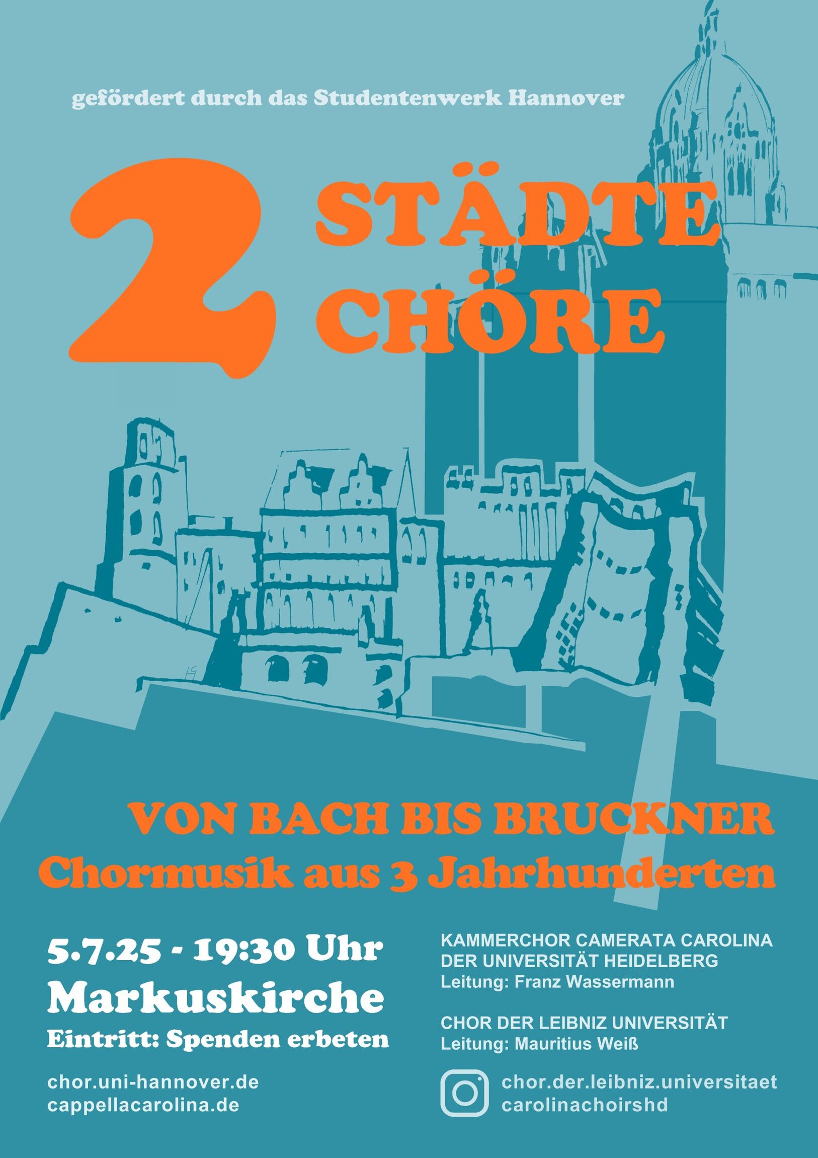 Herzliche Einladung zu einem gemeinsamen Chorkonzert des Chores der Leibniz Universität unter der Leitung von Mauritius Weiß mit dem Kammerchor Camerata Carolina der Universität Heidelberg unter der Leitung von Franz Wassermann.