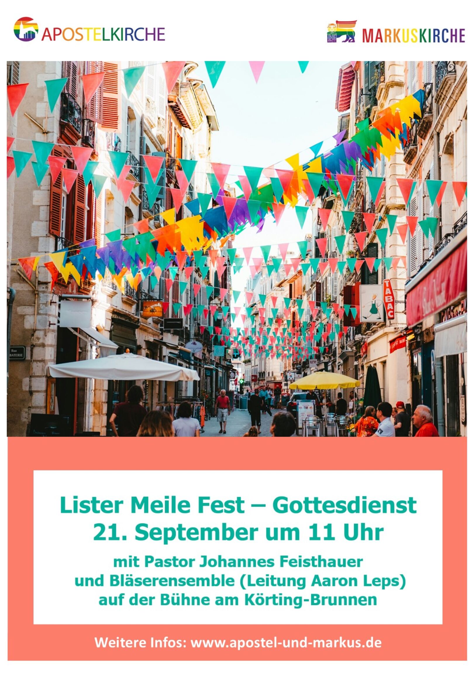 Auch in diesem Jahr wird auf der Lister Meile gefeiert. Wir laden in all dem Trubel zu einer Stunde Gottesdienst auf der Bühne am Körtingbrunnen ein. Am 21. September um 11 Uhr wird Pastor Johannes Feisthauer den Gottesdienst halten. Das Bläserensemble unter der Leitung von Aaron Leps wird Musik machen und die Lieder begleiten.