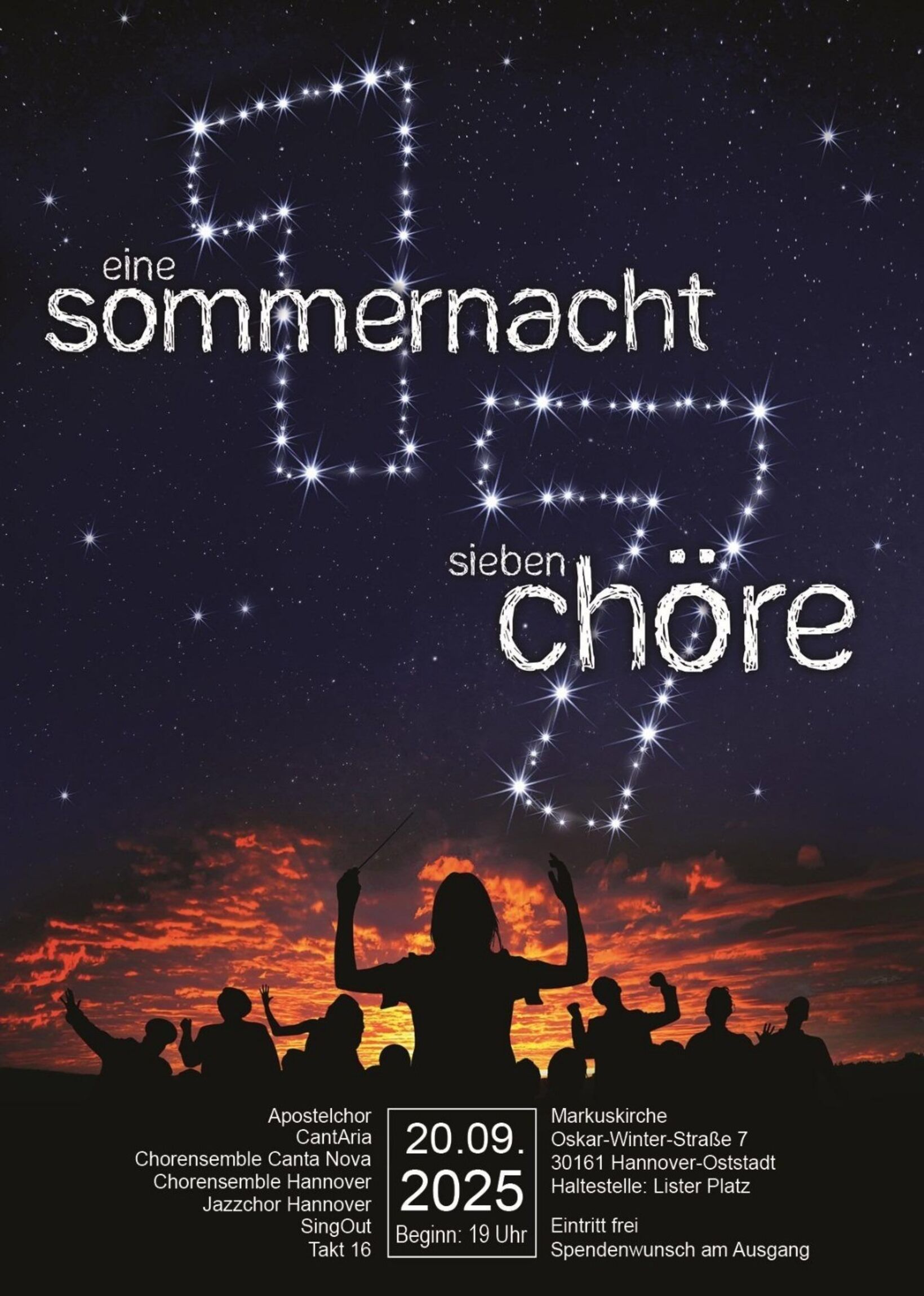 Auch in diesem Jahr feiern wir die Sommernacht der Chöre. 7 Chöre laden zu einem sommerlichen Konzert in die Markuskirche ein.