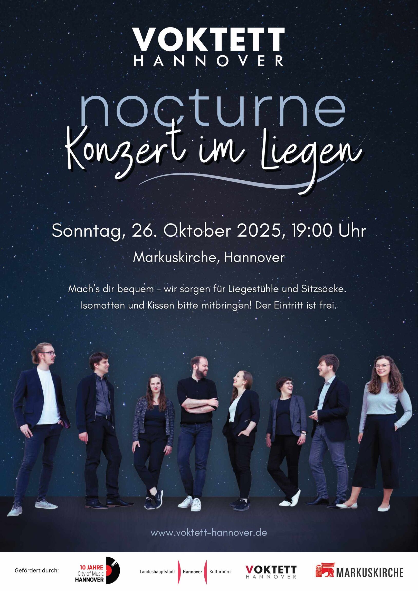 Für einen Abend verwandeln wir die Markuskirche Hannover zum vielleicht gemütlichsten Konzertraum der Stadt. Es erklingen Werke von Josquin Desprez, Palestrina, Poulenc, Rachmaninow, Strauss und anderen, welche die Nacht in all ihren Facetten musikalisch erlebbar machen.Anstelle starrer Sitzreihen erwartet das Publikum eine entspannte Atmosphäre mit Liegestühlen, Sitzsäcken und stimmungsvoller Beleuchtung. Sie dürfen es sich ganz nach Belieben bequem machen, gerne auch mit eigener Decke oder einem Lieblingskissen. So entsteht ein einzigartiger Konzertabend, der entschleunigt, zum Träumen einlädt – und zur Ruhe kommen lässt. Wir freuen uns auf Ihren Besuch!