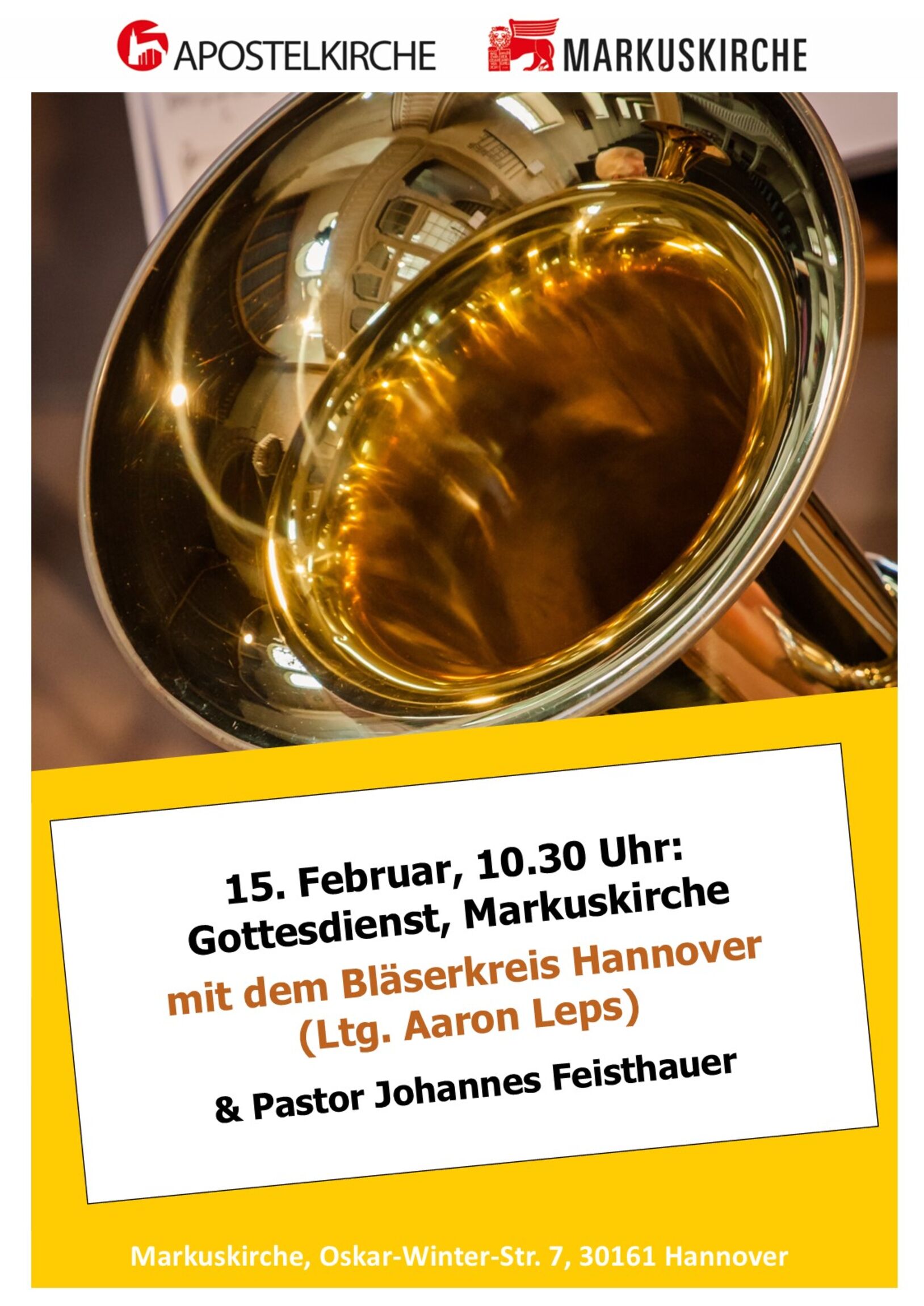 Ein Gottesdienst mit festlichen Bläserklängen vom Bläserkreis Hannover unter der Leitung von Aaron Leps erwartet sie am Sonntag, den 15. Februar um 10.30 Uhr in der Markuskirche.