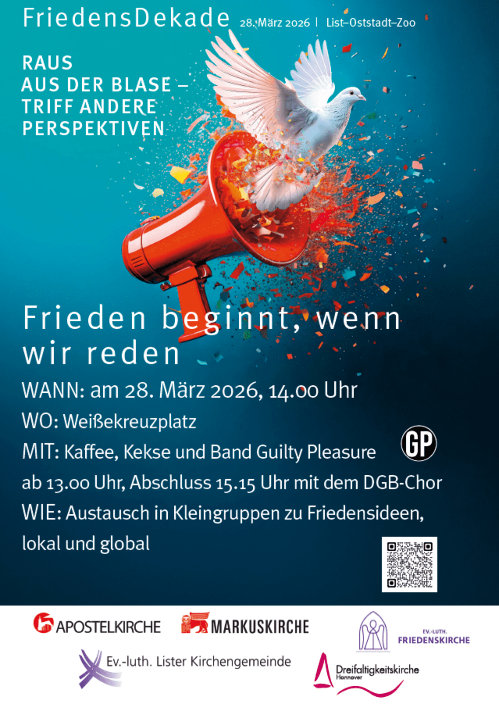Daher laden wir alle Interessierten ein zur öffentlichen Veranstaltung „Frieden beginnt, wenn wir reden" am 28. März 2028 um 14 Uhr auf dem Weißekreuzplatz in Hannover.
