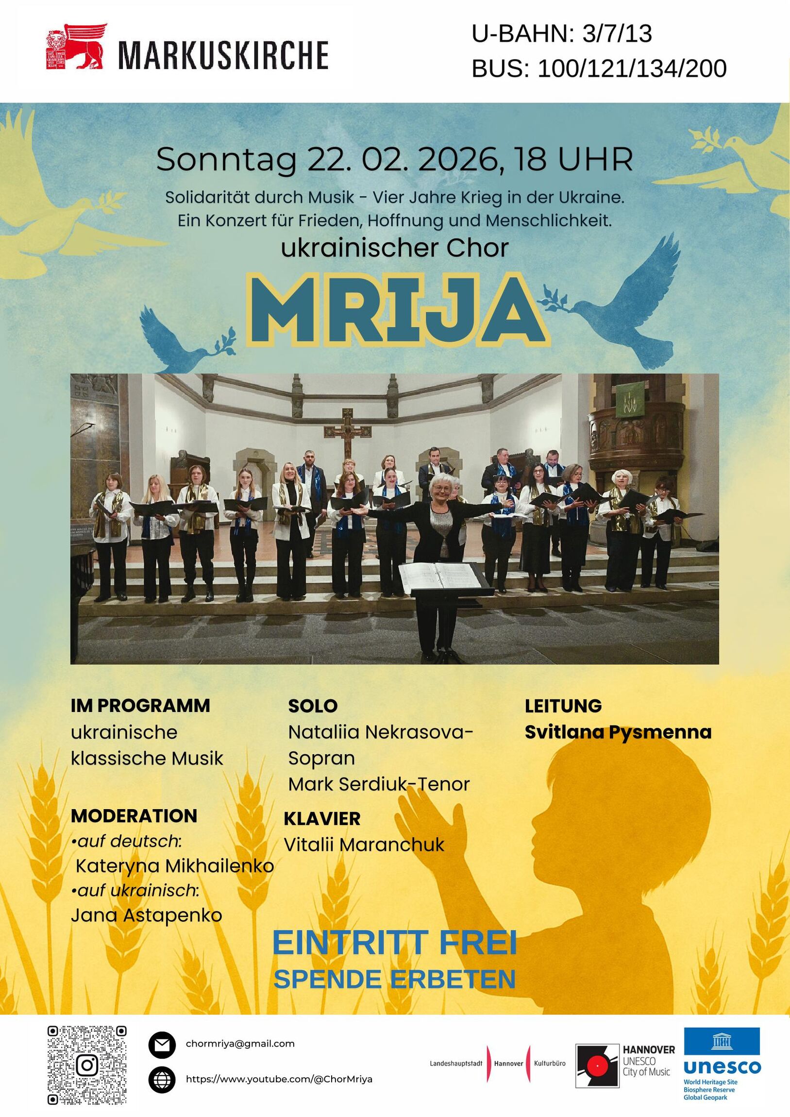 Der Ukrainische Chor "Mrija" lädt ein zu einem Konzert zum 4. Jahrestages des russischen Angriffskrieges in der Ukraine am 22. Februar um 18 Uhr in der Markuskirche.