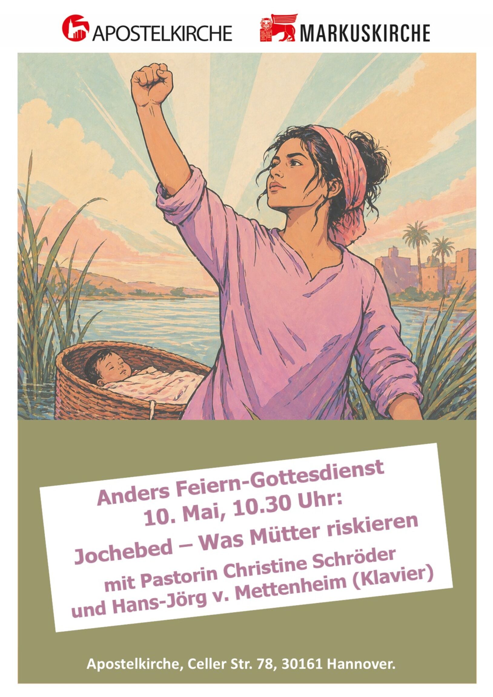 Herzliche EInladung zum Gottesdienst über Jochebed, die in ihrem mutigen Glauben und durch kluge Entschlossenheit das Gesetz des Pharaos brach, um das Leben ihres Sohnes Mose zu retten und so die Befreiung ihres Volkes erst möglich zu machen.