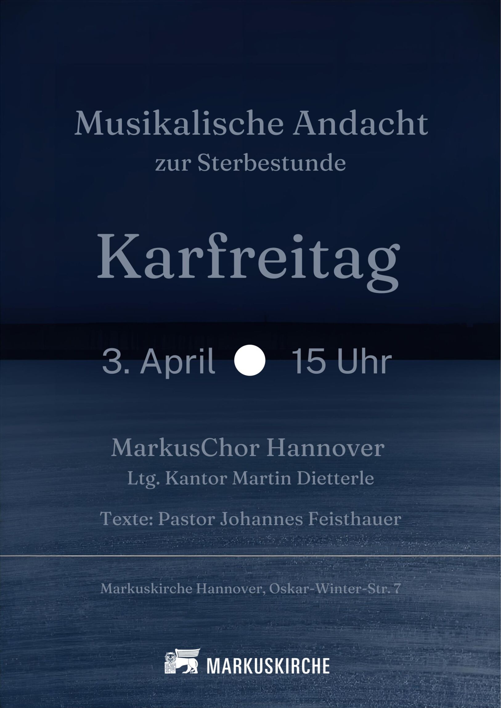 Am Karfreitag, 3. April 2026 um 15 Uhr, zur Sterbestunde Christi, feiern wir eine Musikalische Andacht in der Markuskirche mit dem MarkusChor unter der Leitung von Kantor Martin Dietterle.