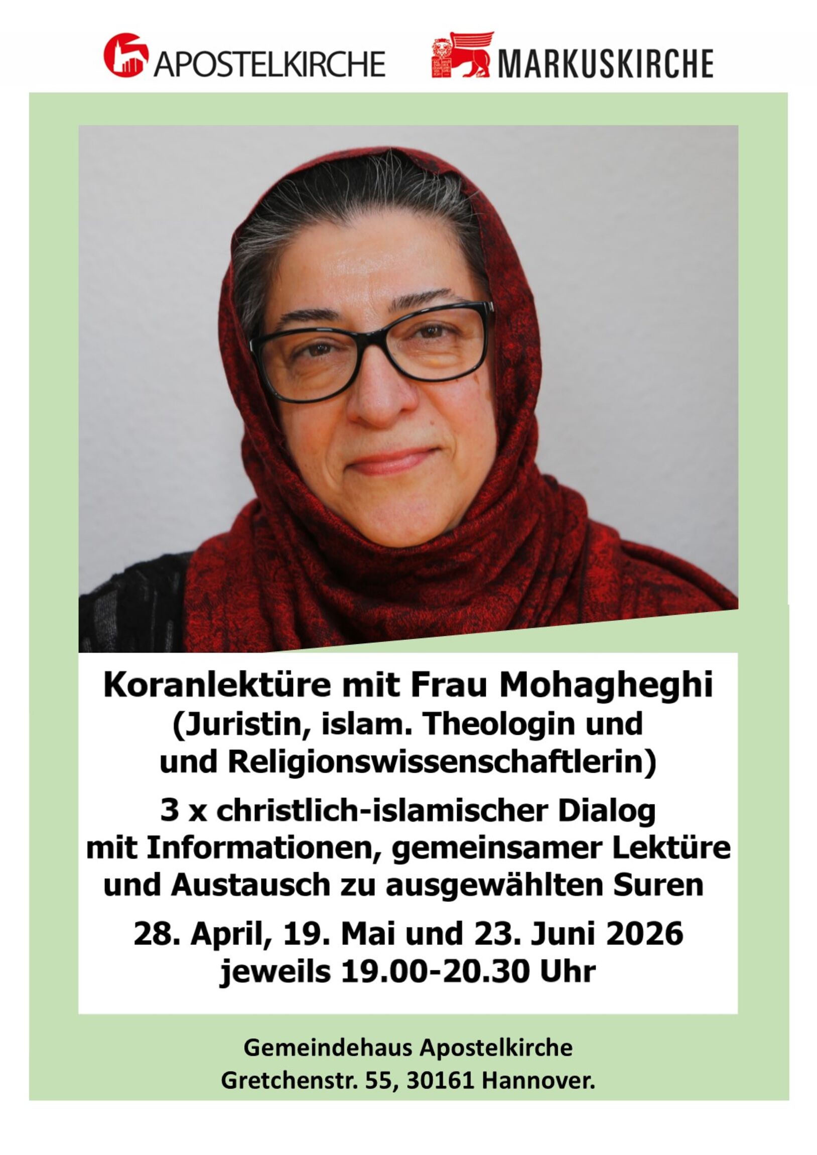 Frau Mohagheghi wird den Teilnehmenden an jedem Abend einige grundlegende Informationen zum Koran geben. Darüber hinaus wird es Raum geben, über die Texte ins Gespräch zu kommen. Dabei kommt es nicht auf Vorwissen an, sondern darauf, Vertrautes und Fremdes wahrzunehmen und sich darüber auszutauschen. Die drei Abende finden jeweils Dienstagabends um 19 Uhr, am 28. April, 19. Mai und 23. Juni im Gemeindehaus Gretchenstraße 55 statt. Die Abende bauen zwar aufeinander auf, können aber auch für sich besucht werden.