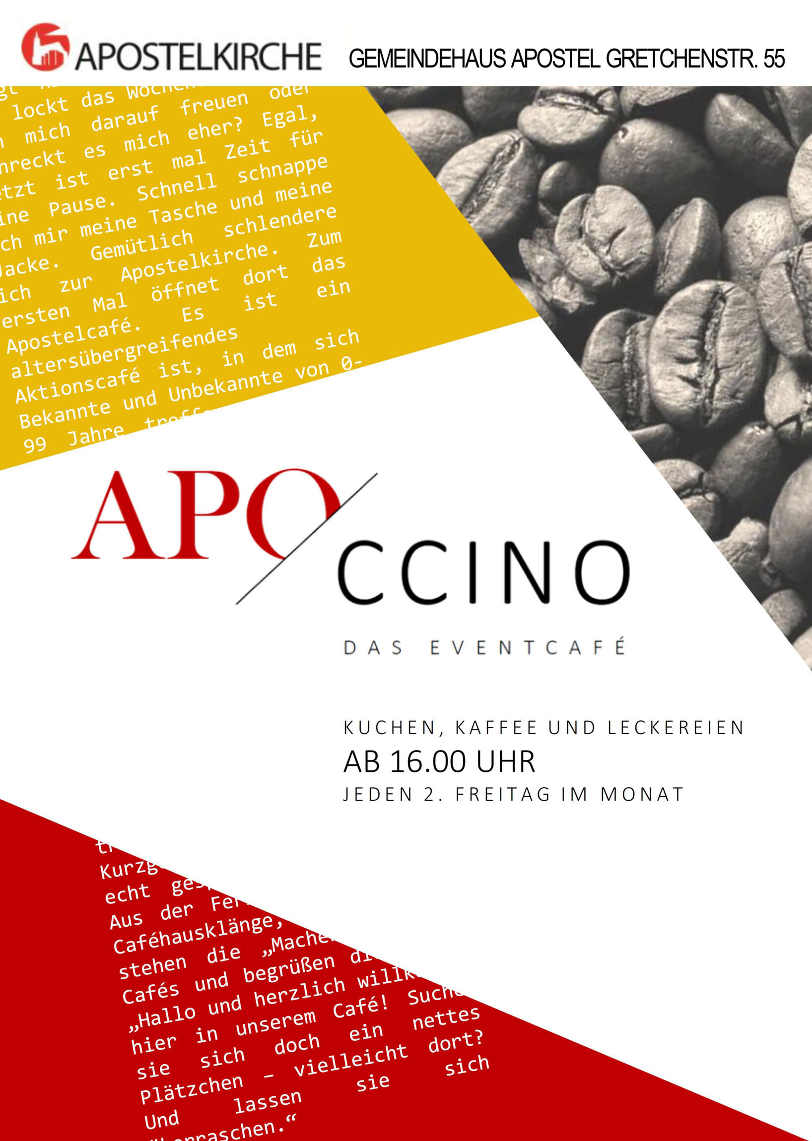 Freitagnachmittag – das Wochenende kündigt sich an. Um 16 Uhr öffnet das Apoccino seine Türen – ein generationsübergreifendes Aktionscafé, in dem sich Bekannte und Unbekannte von 0 bis 99 Jahren treffen. In netter Atmosphäre locken Getränke, selbstgebackene Torten und andere Leckereien. Man kann Freunde treffen und gleichzeitig neue Leute kennenlernen. Das geht ganz nebenbei, denn es gibt immer ein Aktionsprogramm, wie z. B. Lesungen, Zauberei, Musik, Interviews mit Stadtteilläden und manchmal auch eine offene Bühne. Da tragen Gäste Eigenes vor, natürlich freiwillig. An der Tür stehen die „MacherInnen“ des Cafés und begrüßen die Gäste: „Hallo und herzlich willkommen hier in unserem Café! Suchen sie sich doch ein nettes Plätzchen – vielleicht dort? Und lassen sie sich überraschen.“