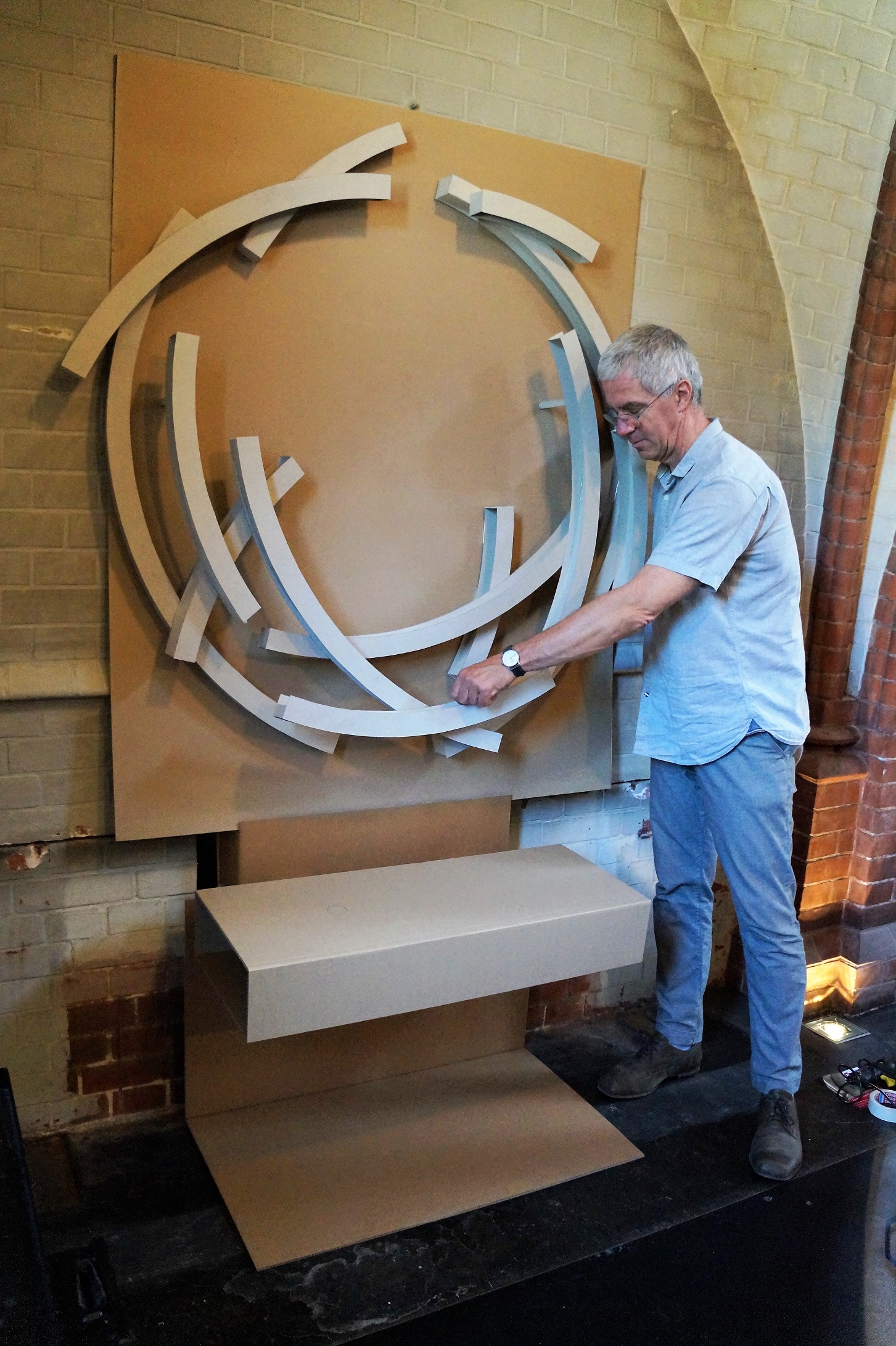 Letztendlich entschied sich die hochkarätig besetzte Jury einstimmig für den Vorschlag von dem Metallkünstler Thomas Leu aus Halle an der Saale. Unter dem Arbeitstitel „Lichtquelle“ ziert nun t ein kranzartiges Objekt die Stirnwand der Gebetsecke. Mehrdimensional aus Stahl gearbeitet, bildet es einen interessanten Blickpunkt. In den einzelnen Segmenten können Teelichter entzündet werden, deren Lichtschein sich in den in einem warmen Bronzeton angelassenen Oberflächen facettenreich widerspiegelt.