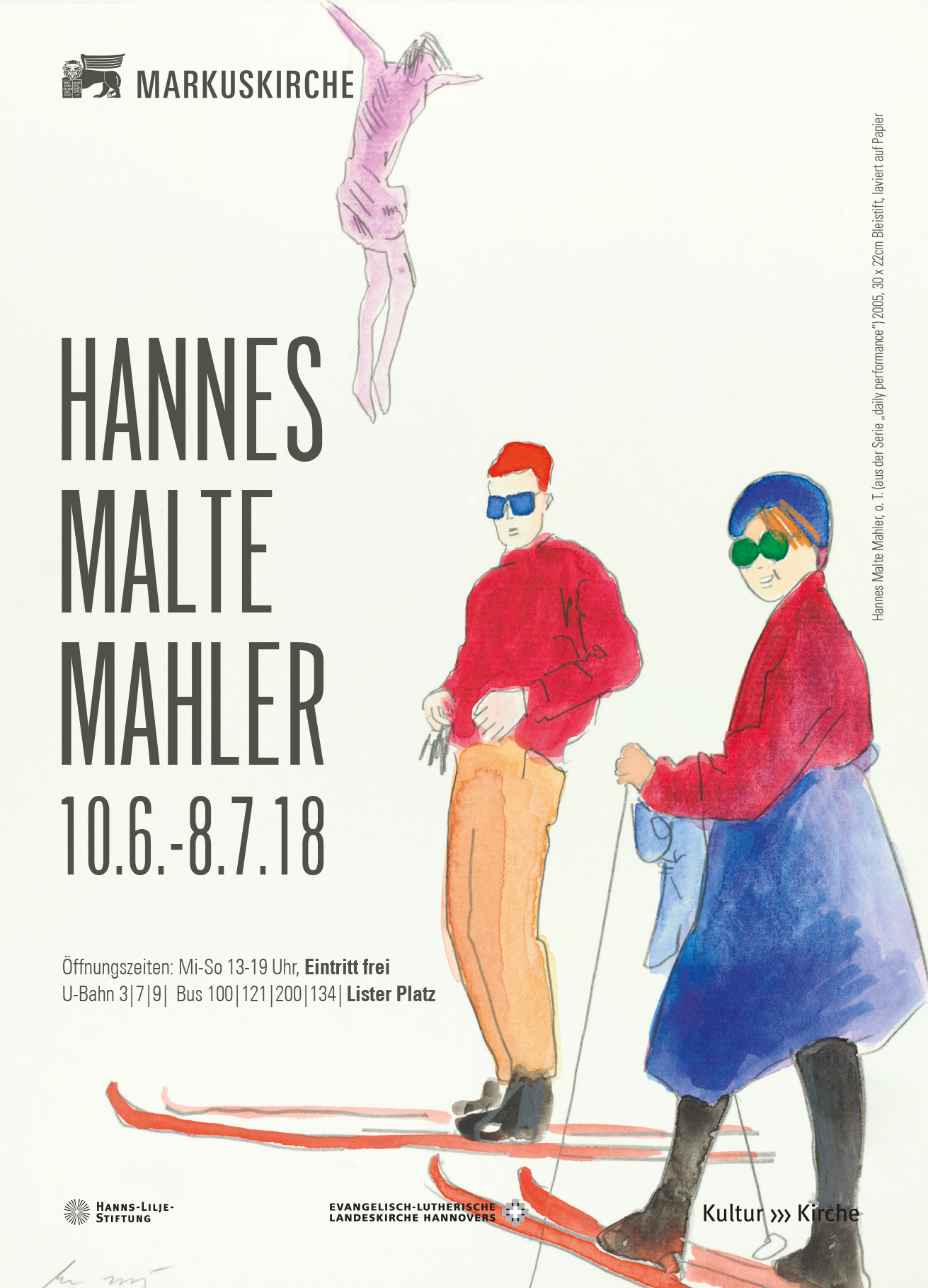 Hannes Malte Mahler (1968-2016) war ein sensibler Beobachter, der in seinen Werken innere Befindlichkeiten, alltägliche Lebenssituationen und Momente des Zeitgeists auf humorvoll-nachdenkliche Weise miteinander verschränkte. In seiner vielfältigen bildnerischen Praxis nutzte er die verschiedensten Medien, um eine oberflächliche Wahrnehmung von „Normalität“ auf die dahinter liegenden Untiefen und Brüche auszuloten und die Phantasie des Betrachters zu Assoziationen und Gegenbildern anzuregen. Ab 2014 bis zu seinem tragischen Unfalltod 2016 hat Mahler das grafische Erscheinungsbild der Kulturkirche durch seine Arbeit wesentlich geprägt. Die Ausstellung zeigt nicht nur seine Plakatentwürfe für die Kulturkirche, sondern ausgewählte Arbeiten (Ölgemälde, fotobasierte Arbeiten inkl. digitaler Loops, Papierarbeiten, Leuchtkästen) aus dem großen Nachlass-Fundus, den Feinkunst e.V. (Vorsitz: Oliver Rohde) verwaltet.