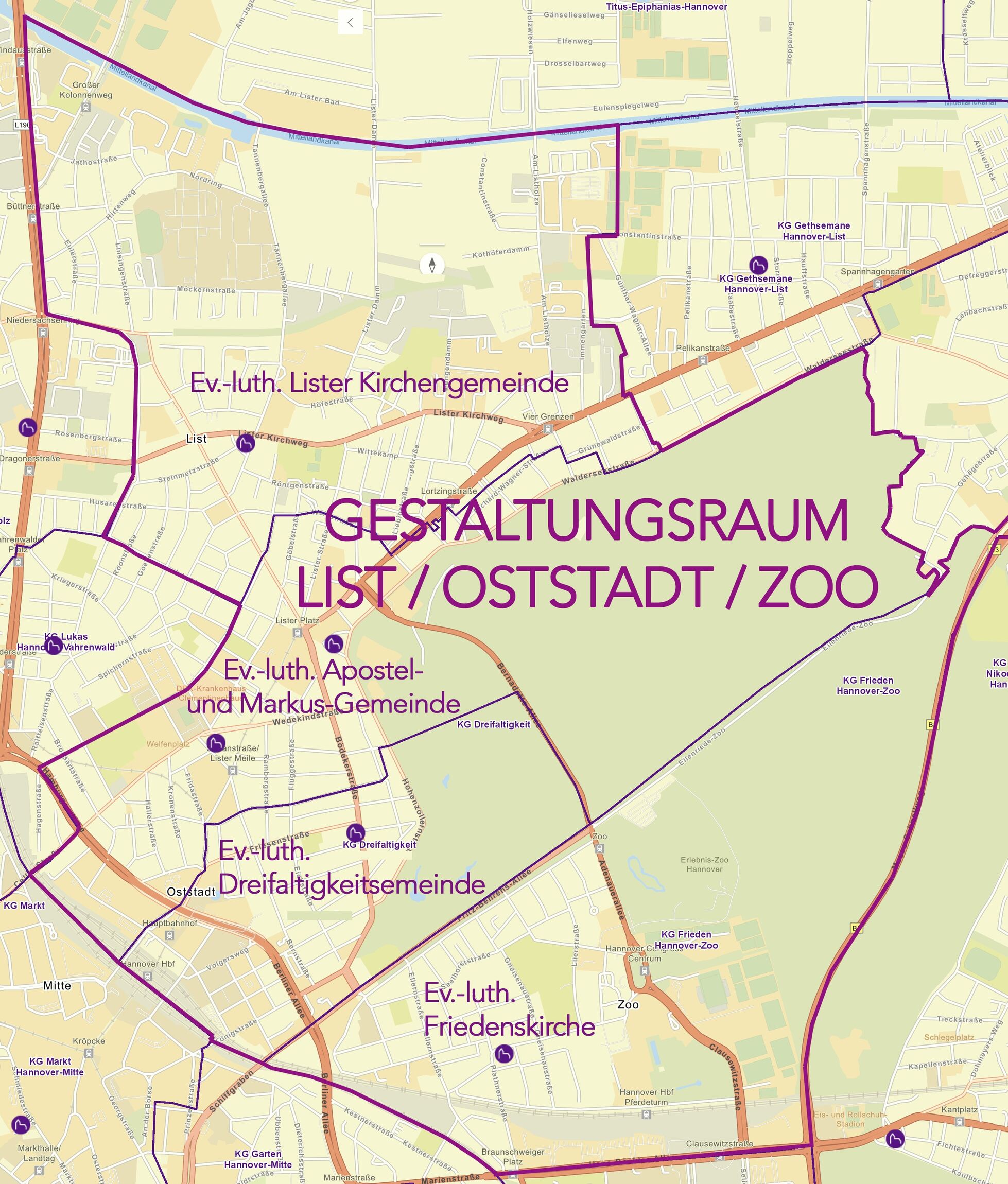 "Gestaltungsraum" nennen wir die Kooperationsgemeinschaft der vier Kirchengemeinden, die in den Stadtteilen List, Oststadt und Zoo miteinander kirchkliches Leben gestalten wollen: